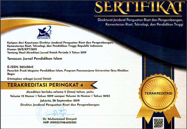 TAWAZUN (pISSN: 1978-6786) adalah jurnal ilmiah pendidikan Islam yang diterbitkan oleh Program Studi Magister Pendidikan Islam, Sekolah Pascasarjana Universitas Ibn Khaldun Bogor. Jurnal ini mempublikasikan artikel ilmiah yang berfokus kepada: manajamen pendidikan Islam, pemikiran dan sains...